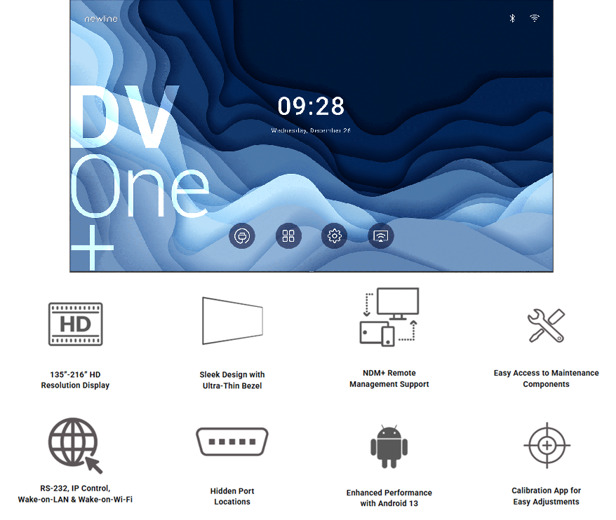 Experience the power of Newline DV One+, an advanced LED display solution that combines durability with stunning visuals. Built with glue-on-board (GOB) technology, it ensures reliability and low maintenance. With a wide color gamut and a 6000:1 contrast ratio, it delivers lifelike images. Perfect for indoor advertising or conference rooms, DV One+ offers smooth visuals and high refresh rate 3840 Hz. Available in large 4 size options: 135", 163", 189" and 216", DV One+ makes a statement in any space.