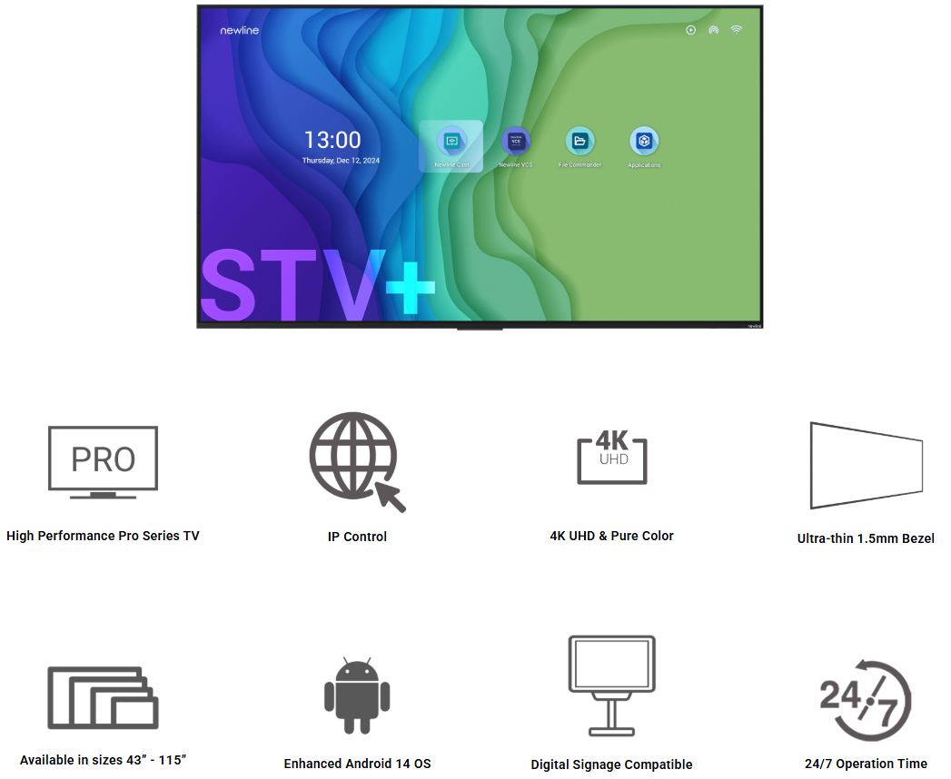 The Newline STV+ enhances business presentations, classroom lessons, and digital signage with stunning 4K visuals, up to XDR 2000 nits brightness, and an ultra-high 7000:1 contrast ratio, all wrapped in a sleek, modern design. Available in a wide range of sizes from 43" to 115", it fits perfectly into any environment. Cast+ enables instant content sharing from any device, while seamless integration with Signage Pro software streamlines content management. Display Management Plus centralizes control of settings and updates across all screens.